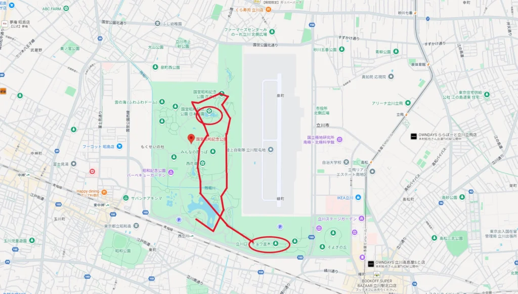 昭和記念公園は非常に広大なため、事前にルートを計画しておくことが重要です。今回は西立川口からスタートし、紅葉スポットを効率よく巡るルートを選びました。